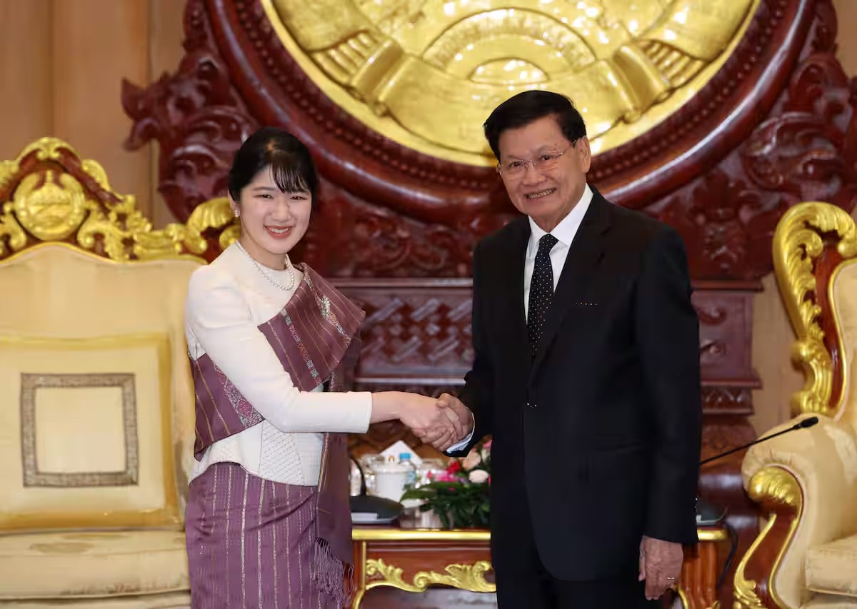 Princess Aiko shakes hands with Laotian President Thongloun Sisoulith during a courtesy visit on November 18 in Vientiane.