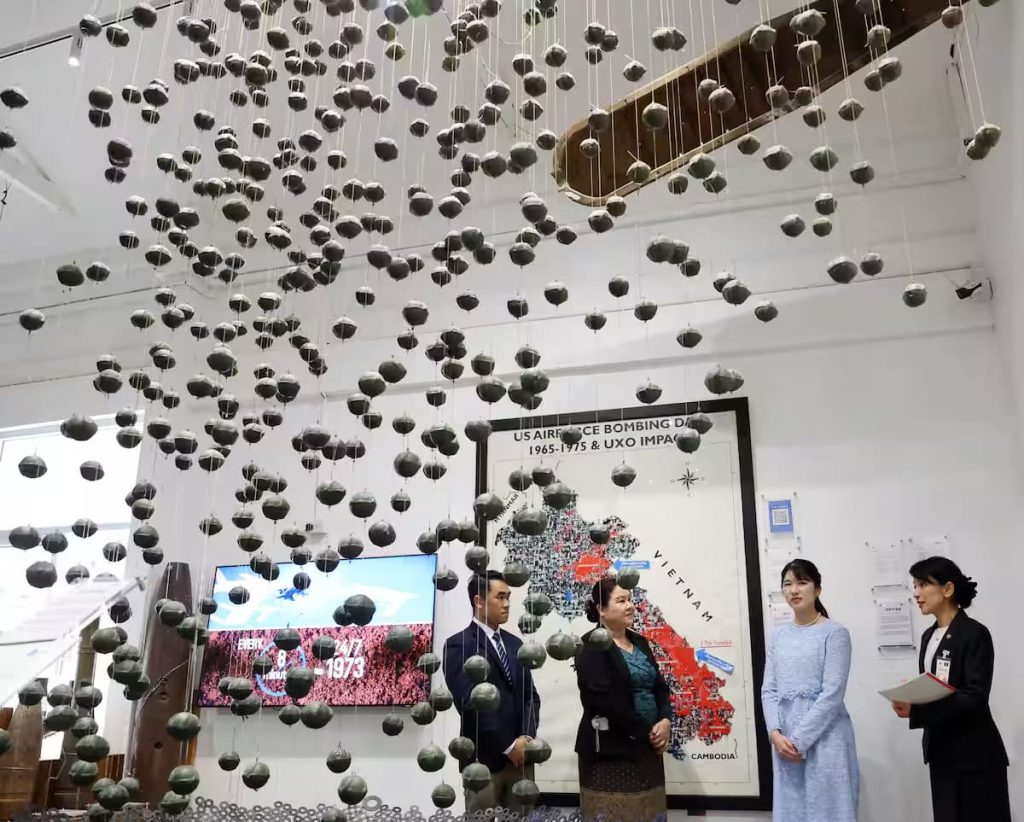 Princess Aiko visits the COPE Visitor Center in Vientiane on November 19 to view a cluster bomb exhibit highlighting unexploded ordnance from US airstrikes during the Vietnam War.