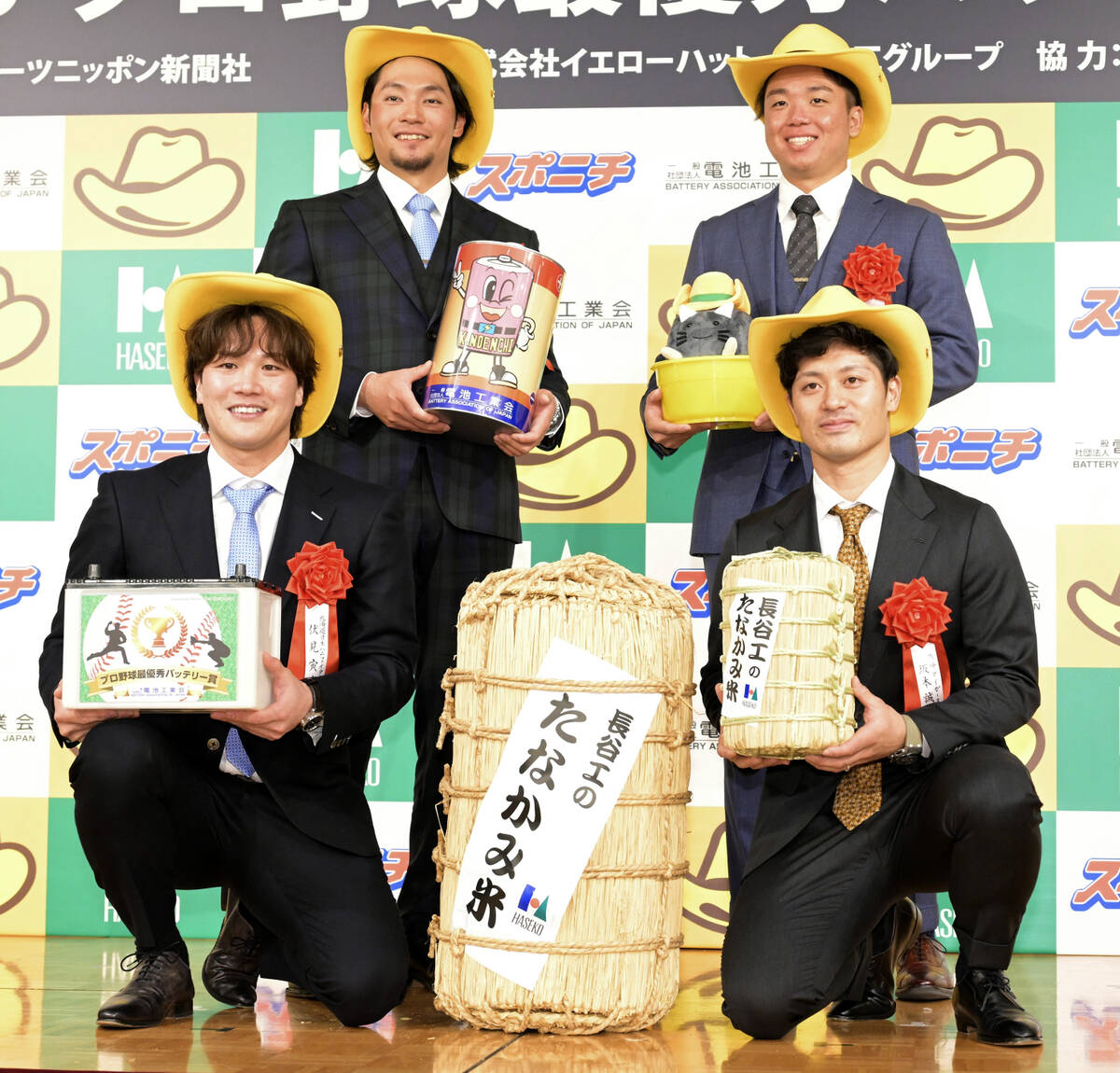 最優秀バッテリー賞に選ばれた日本ハム・伊藤大海、伏見寅威、阪神・阪本誠志郎、村上頌樹