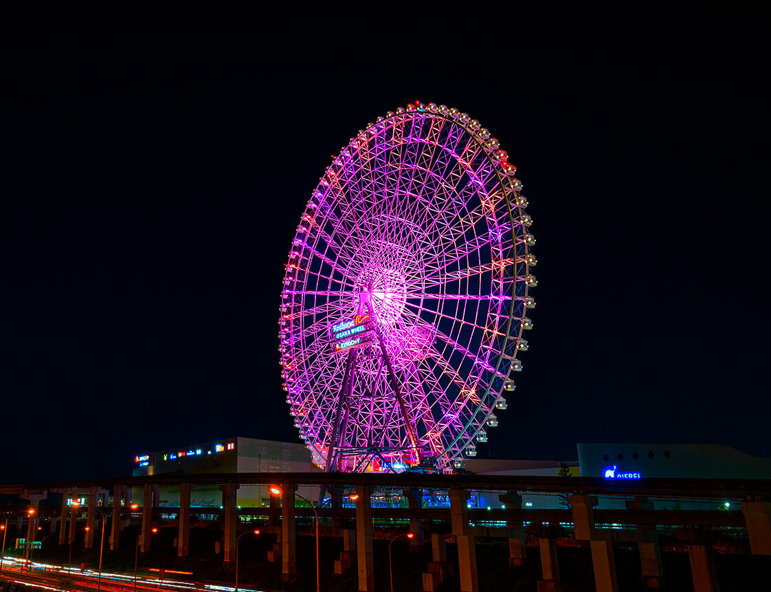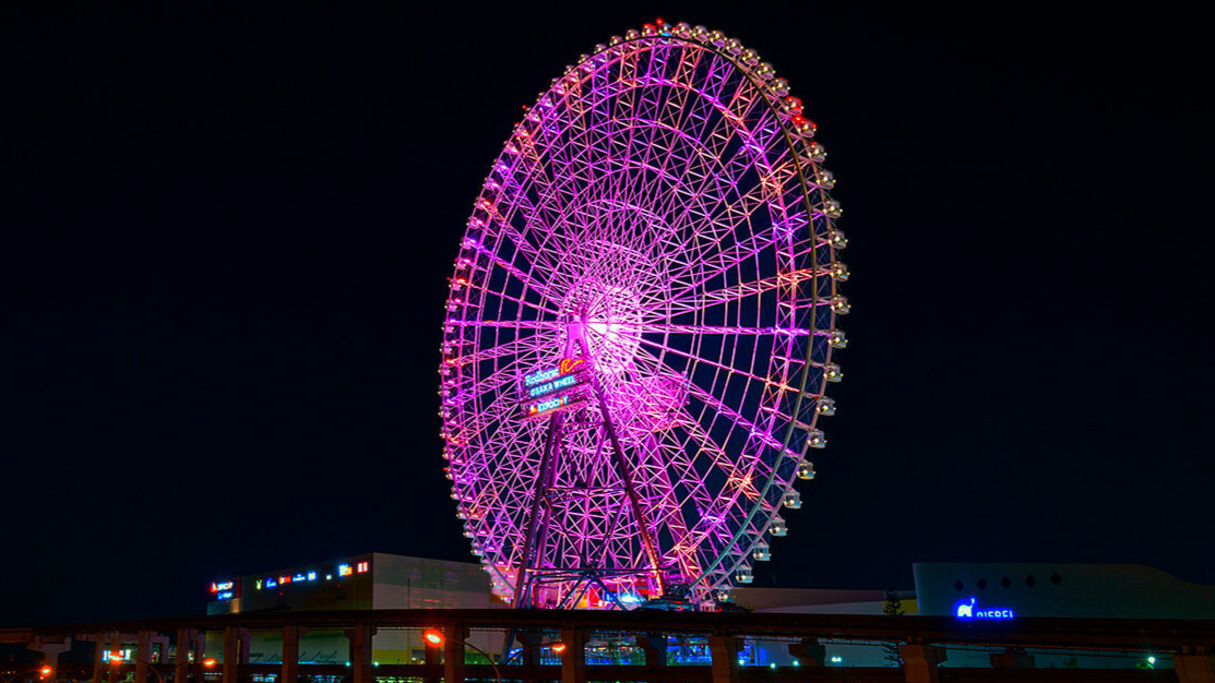Osaka Wheel, Japan’s tallest Ferris wheel, is an attraction within the Expocity shopping mall and movie multiplex in Suita, Osaka Prefecture.