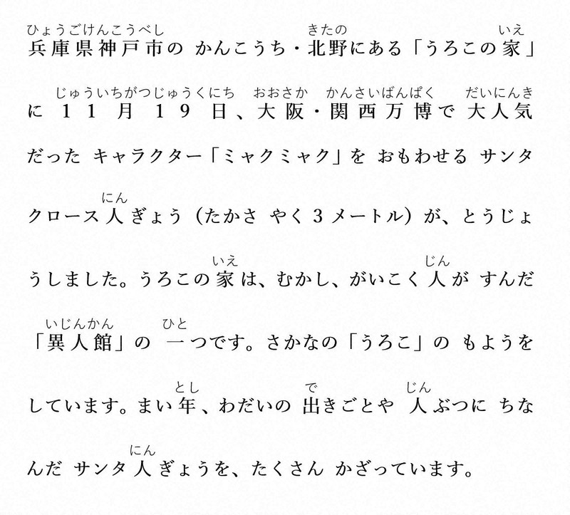 On November 19, a Santa Claus doll (approximately 3 meters tall) that resembles “Myaku-Myaku,” the very popular official mascot of the Expo 2025 Osaka, Kansai, was displayed at “Uroko House” in Kitano, a tourist spot in the city of Kobe, Hyogo Prefecture. Uroko House is one of the “Ijinkan” Western-style residences where foreigners once lived, and it features a fish scale pattern. Every year, the house displays many Santa dolls related to notable events and people.