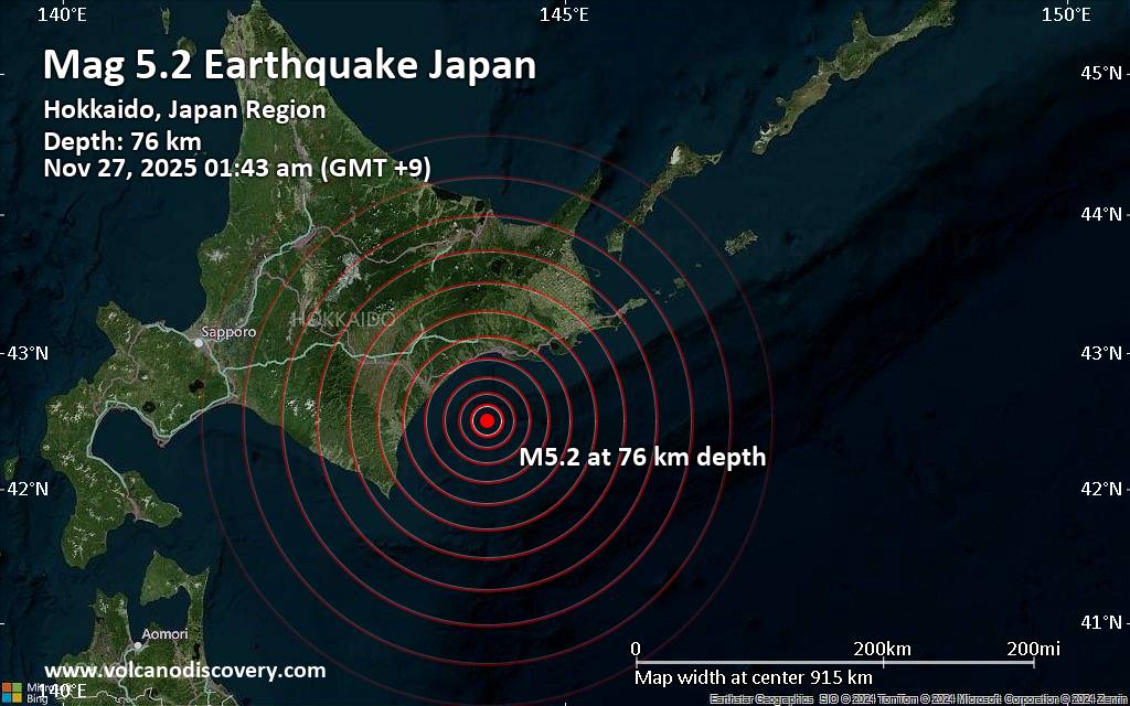 An earthquake of magnitude 5.2 occurred early morning on Thursday, November 27th, 2025, at 1:43 am local time near Kushiro, Kushiro Shi, Hokkaido, Japan, as reported by the European-Mediterranean Seismological Centre (EMSC).