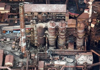 This photo taken from a Kyodo News helicopter shows the site of a fire at a Nippon Steel Corp. plant in Muroran, Hokkaido, on Dec. 1, 2025. (Kyodo)