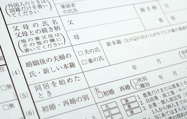 File photo taken in June 2021 shows a marriage registration form, on which couples are asked to check a box indicating which surname they will use. (Kyodo)