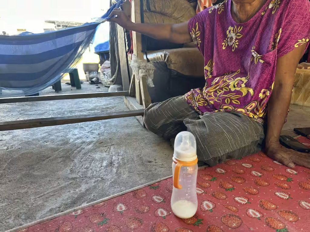 A grandmother who says she raised the 12-year-old Thai girl answers reporters’ questions while babysitting a baby at home in Phetchabun Province in northern Thailand. November 12 (©Kyodo)