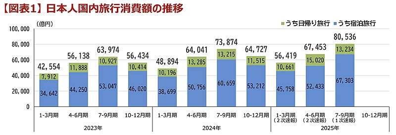 Japan Tourism Agency announced that the total amount of Japanese domestic travel consumption was up 9.0% year on year to 8 trillion yen in the 3rd quarter of 2025 (July to September 2025), which were divided into 6.7 trillion yen for overnight trips (up 11% year on year) and 1.3 trillion yen for day trips (up 0.1% year on year).