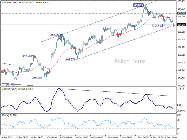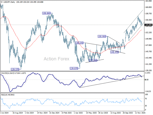 Intraday bias in USD/JPY remains neutral at this point. With near term rising channel floor intact, further rally is expected. Above 156.57 minor resistance will bring retest of 157.88. Further break there will resume the whole rally from 139.87. Next target is 158.86 structural resistance, and then 161.94 high. However, sustained break of the channel support will bring deeper correction to 55 D EMA (now at 153.13), and raise the chance of near term trend reversal.