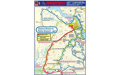 Runners will leave Ounoyama Athletic Park near Naha Military Port at 9 a.m. and head north on Route 58 and Kokusai Street before heading south on Routes 330, 507, and 331. Traffic restrictions will be in place around the course between 8:15 a.m. and 3:15 p.m. The time varies depending upon each section of the course.