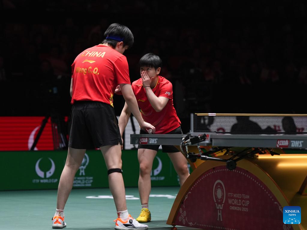 Wang Chuqin/Sun Yingsha (R) of China talk with each other in the mixed doubles match against Matsushima Sora/Odo Satsuki of Japan during the final match between China and Japan at the ITTF Mixed Team World Cup 2025 in Chengdu, southwest China’s Sichuan Province, Dec. 7, 2025. (Xinhua/Wang Xi)