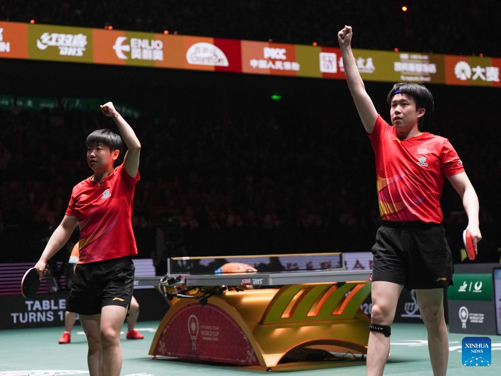 Wang Chuqin/Sun Yingsha (R) of China compete in the mixed doubles match against Matsushima Sora/Odo Satsuki of Japan during the final match between China and Japan at the ITTF Mixed Team World Cup 2025 in Chengdu, southwest China’s Sichuan Province, Dec. 7, 2025. (Xinhua/Wang Xi)