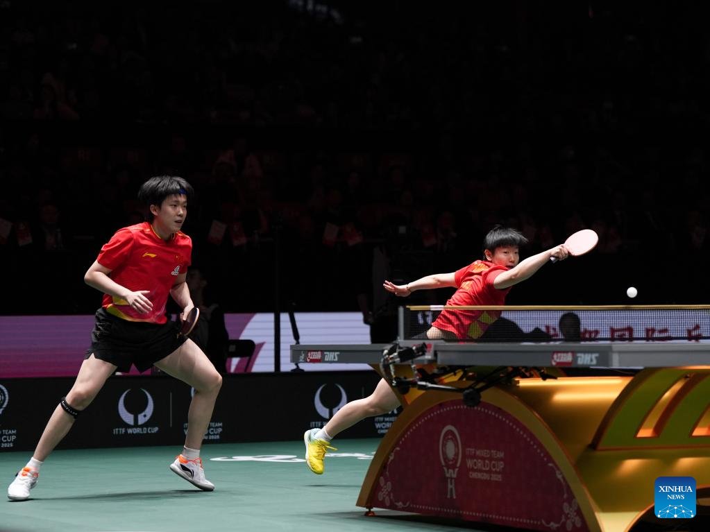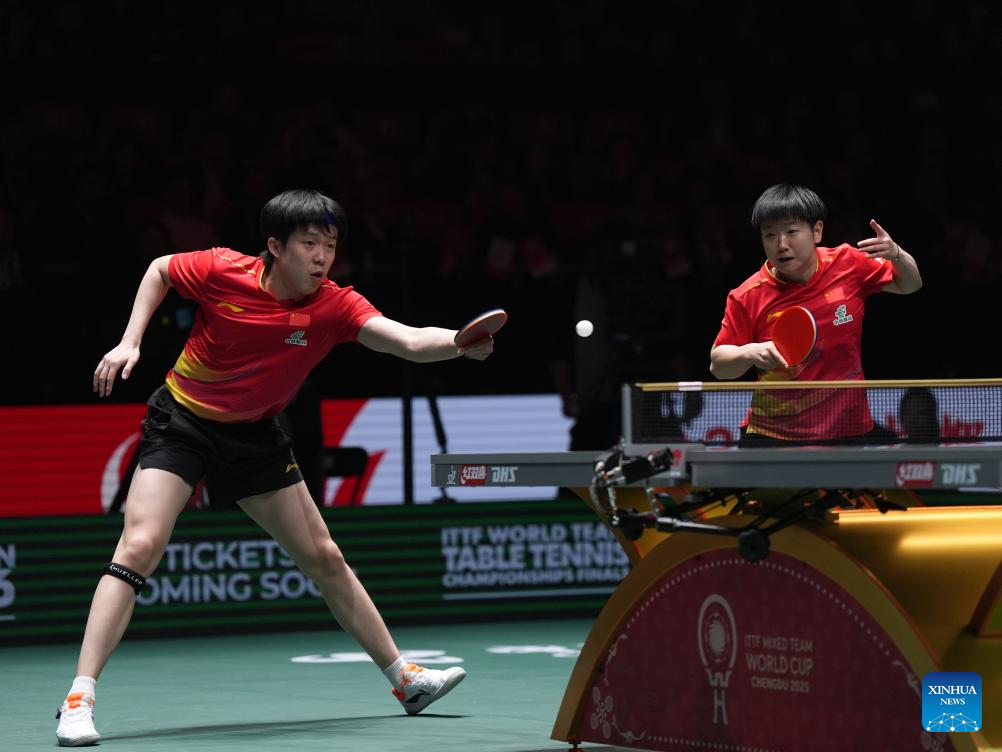 Wang Chuqin (L)/Sun Yingsha of China compete in the mixed doubles match against Matsushima Sora/Odo Satsuki of Japan during the final match between China and Japan at the ITTF Mixed Team World Cup 2025 in Chengdu, southwest China’s Sichuan Province, Dec. 7, 2025. (Xinhua/Wang Xi)