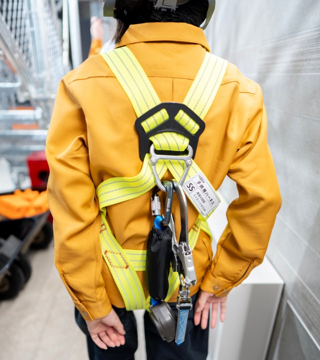 The first task is to repair the exterior wall panels. When they reach the worksite, they must clip their harnesses onto a ceiling rod for safety purposes.