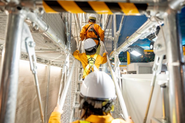 As they begin to climb the stairs to the second-story scaffolding, they’re instructed to hold onto the handrails with both hands.