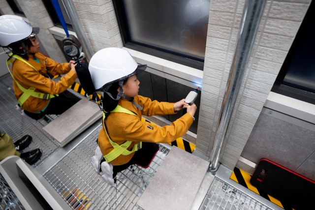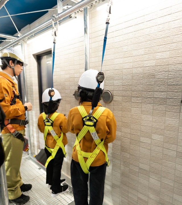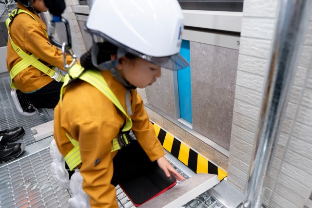 The new Mansion Construction Site (“mansion” in Japanese refers to a multi-story apartment building) is a faithful representation of an actual construction site complete with full-scale scaffolding and equipment. It’s also three stories tall, making it unusually high for most buildings at KidZania. There are three activities for kids to try in this zone: constructing the entrance as a construction engineer (recommended for ages three and up), and inspecting the drainpipes and replacing the exterior wall panels as a maintenance engineer (recommended for ages six and up). As the latter two activities require kids to be hoisted on a harness to the second and third stories, there’s also a 120-centimeter (47.2-inch) minimum height requirement. Each task takes approximately 35 minutes to complete and pays 10 kidZos.
