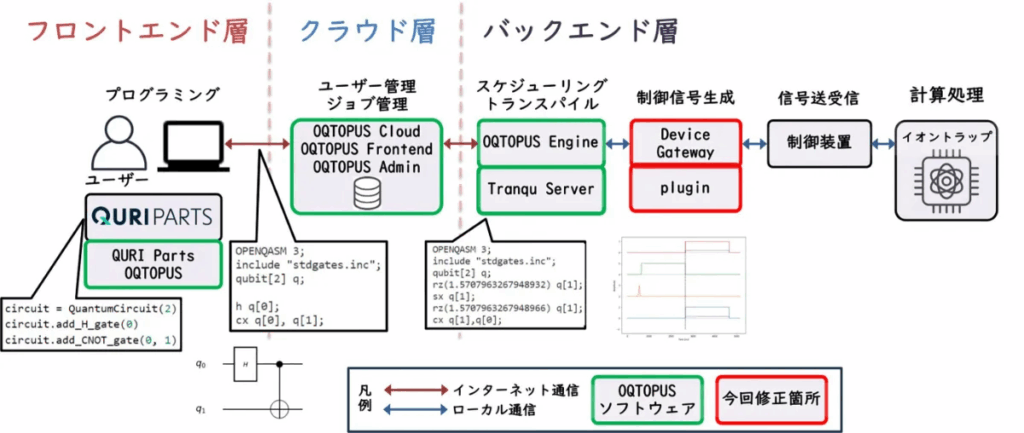 To ensure stable, long-term remote use, the system incorporates essential automation technologies, including automatic ion loading, automatic laser position correction, and continuous status monitoring. This integrated control system allows the ion trap qubits to be maintained without researchers having to directly interact with the equipment, paving the way for a quantum computing platform capable of 24-hour operation. The cloud connection is realized using the open-source software platform OQTOPUS (Open Quantum Toolchain for Operators and Users), developed at Osaka University QIQB.