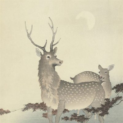 The art piece above is by Ohara Koson (1877–1945), a master of kachō-ga whose delicate touch continues to enchant art lovers across generations. Unlike the subtle, spiritually infused approach of Sawako Utsumi, Koson turns his gaze entirely toward the unadorned beauty of the deer itself. He seeks not hidden symbolism, but the poetry of form, stillness, and natural grace.