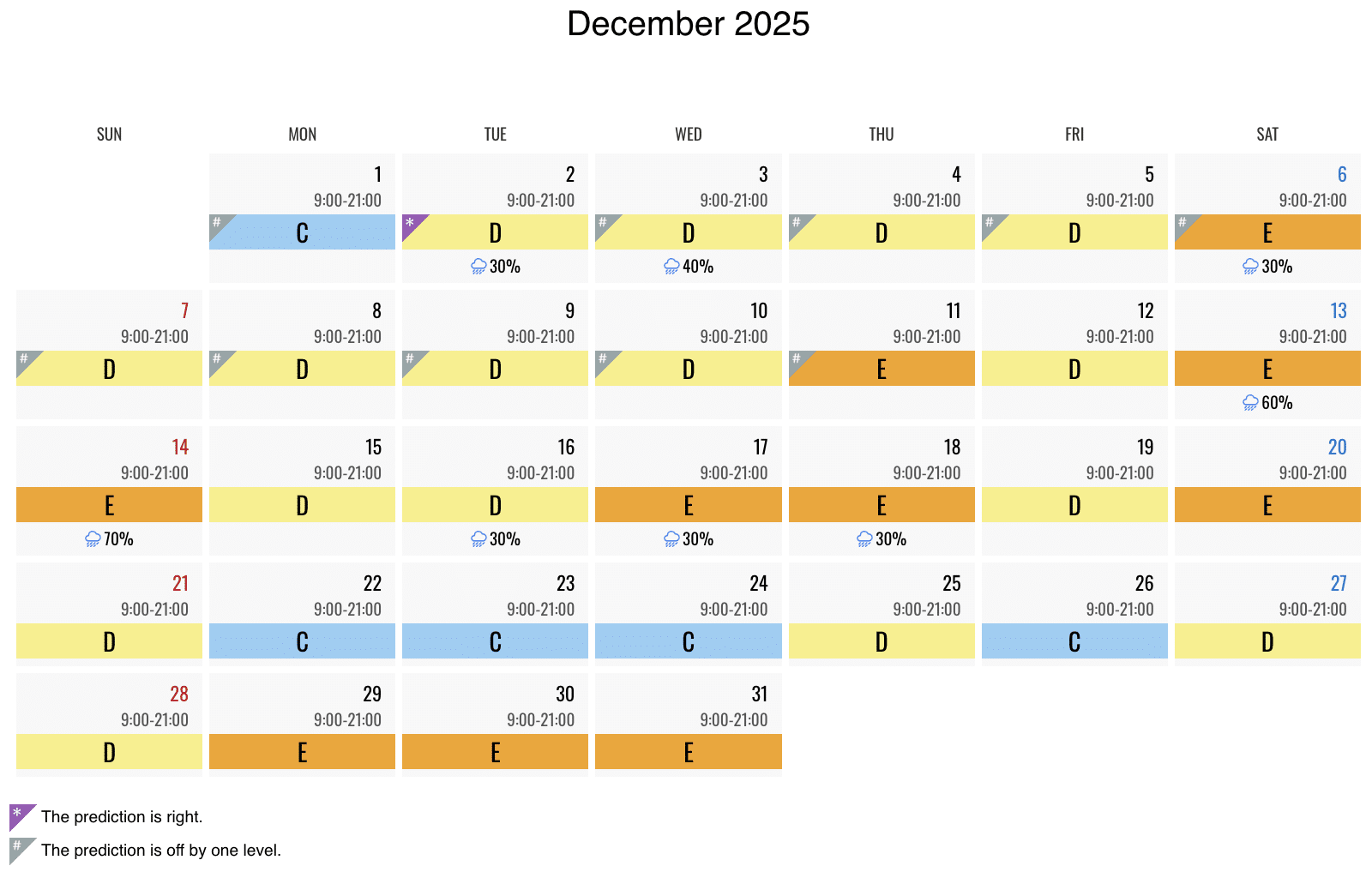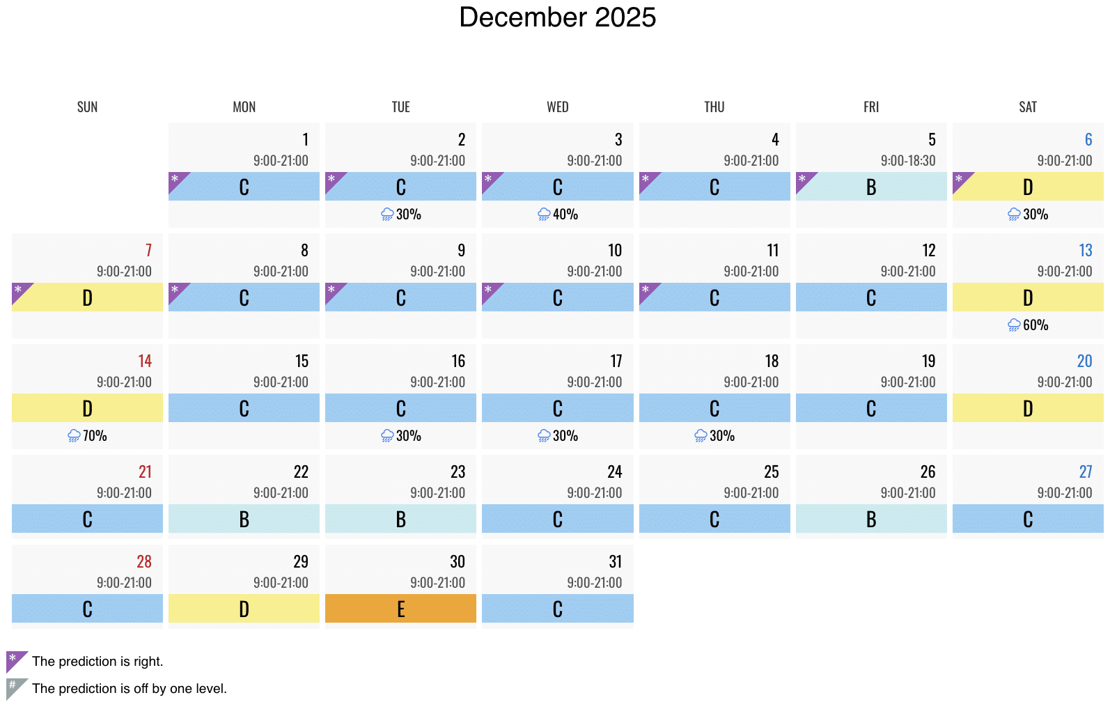 This is actually a crowd calendar we started watching after our visit last Christmas, and began recommending earlier this year. Based on our observations from afar, it seemed like the Kidokoma crowd calendar often nailed crowd levels, including more unlikely ones.