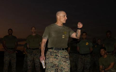 U.S. Marine Corps Sgt. Maj. Sael Garcia, sergeant major of 1st Marine Aircraft Wing, speaks to leaders with 1st MAW after a physical training session on Marine Corps Air Station Futenma, Okinawa.