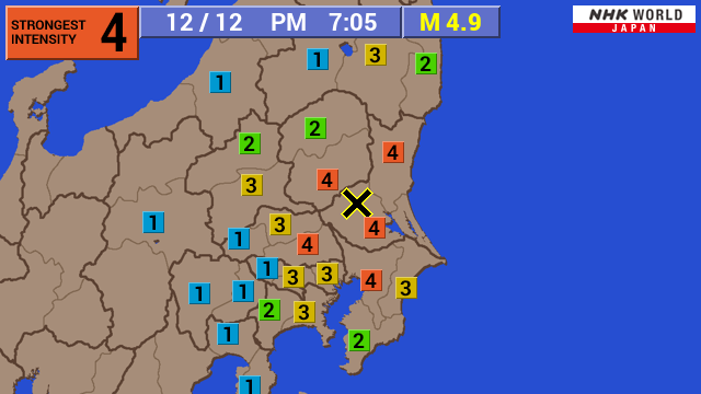 The agency says the quake occurred in southern Ibaraki Prefecture at 7:05 p.m. and had a maximum intensity of 4 out of 7 on the Japanese scale. It had an intensity of 3 in central Tokyo.