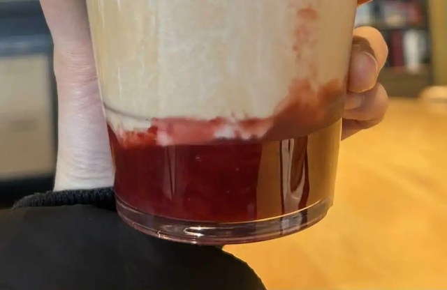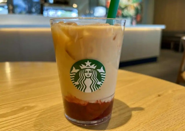 Unlike the hot Joyful Medley Tea Latte, the Joyful Medley Strawberry Milk Tea is served cold, and, of course, there’s the addition of strawberry, Japan’s favorite Christmas dessert flavor. Before starting her taste test, Masami took a moment to admire how pretty the drink is, with a distinct division between the layers of creamy tea and crimson strawberry sauce. With a Starbucks-green straw popped into the glass, she had all the traditional Christmas colors.
