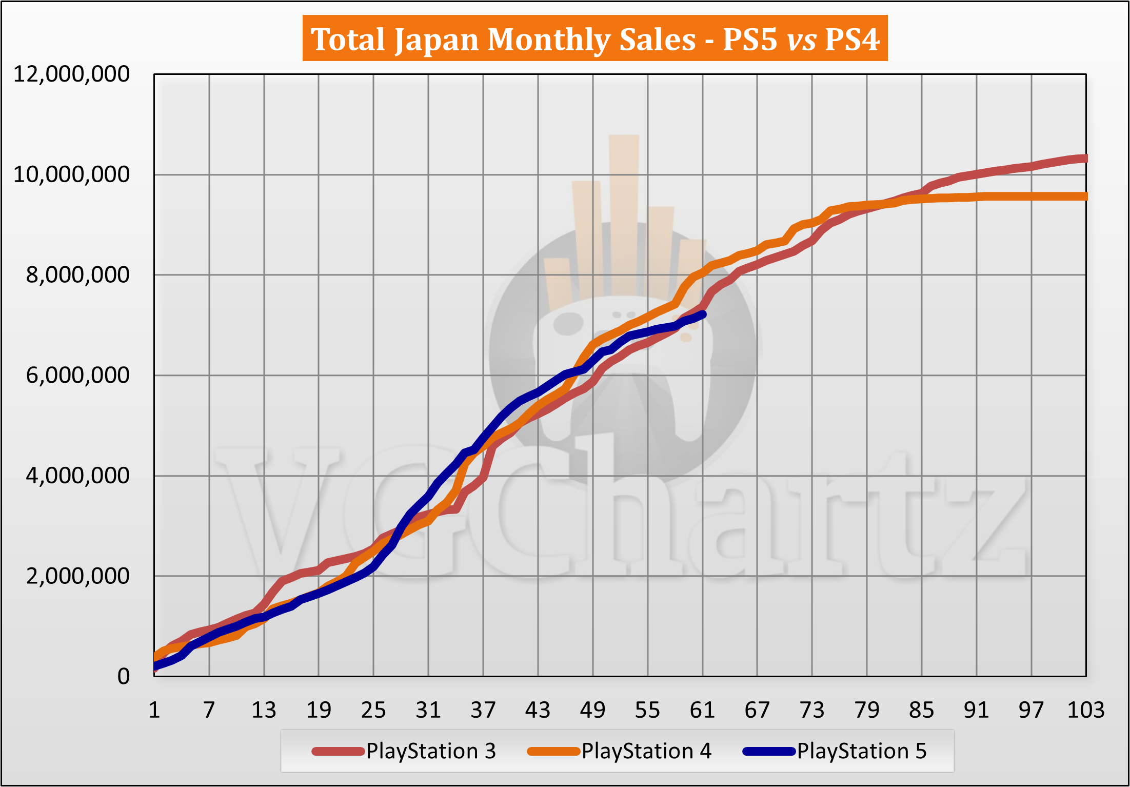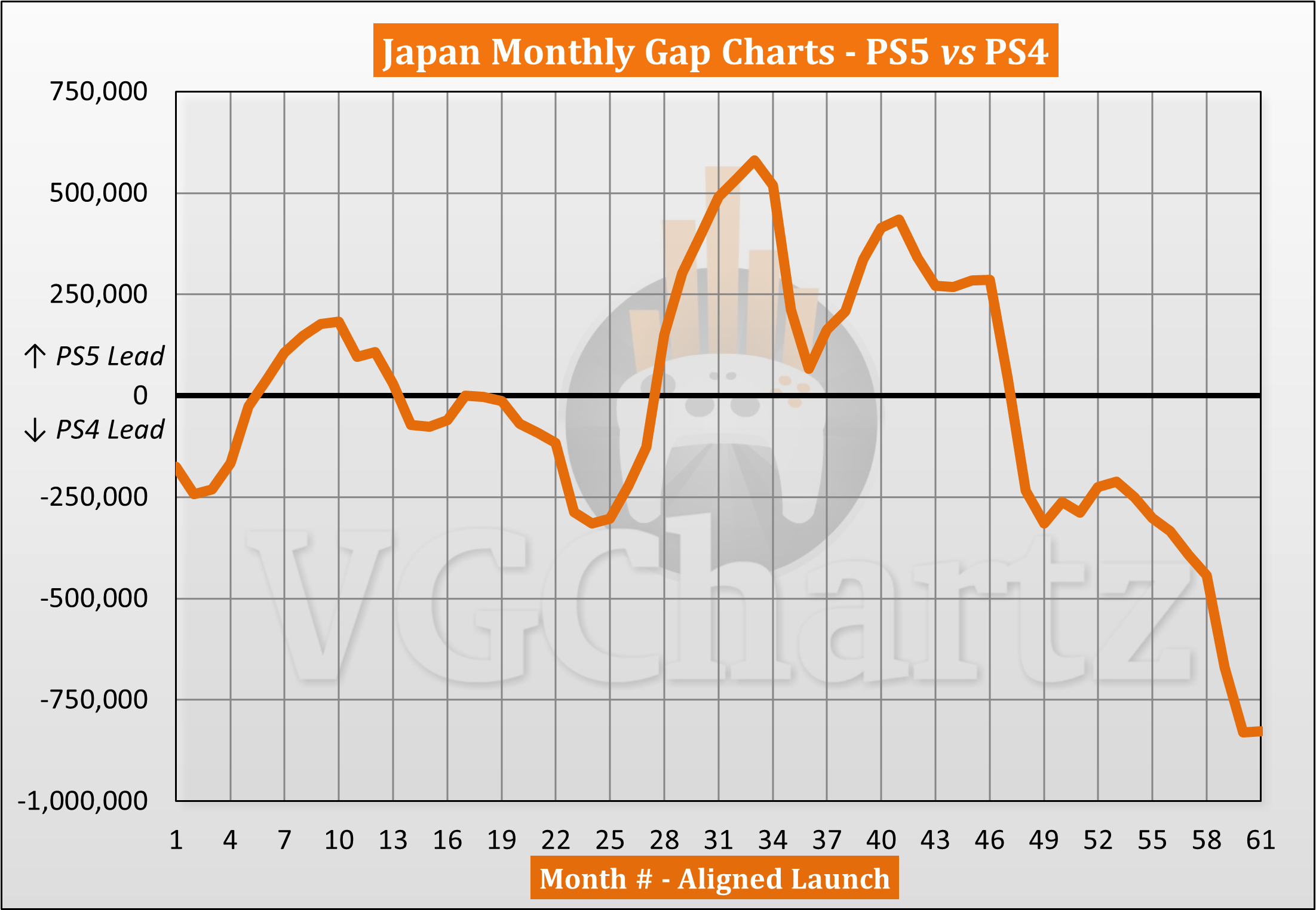 This monthly series compares the aligned Japanese sales of the PlayStation 5 and PlayStation 4.