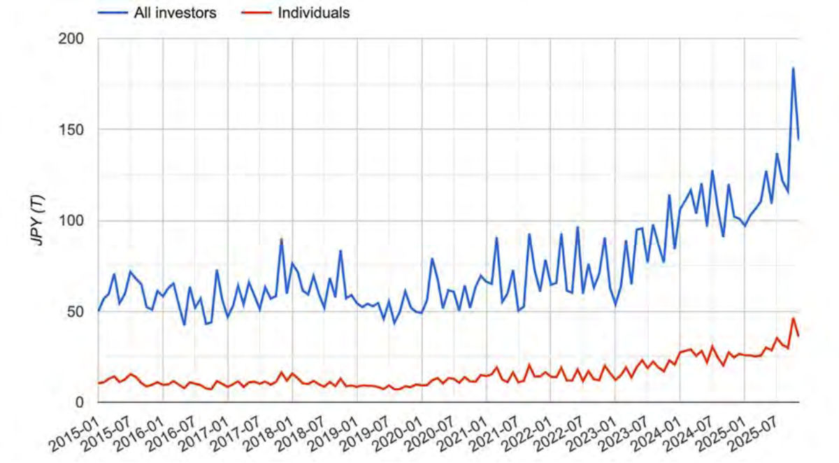 Japanese equity markets are on a roll. Volumes on the Tokyo Stock Exchange and JapanNext, the two main cash markets, are at all-time highs, as well as the index itself. Retail trading as a percentage of the total daily volume reached 31.5% in November according to TSE data.