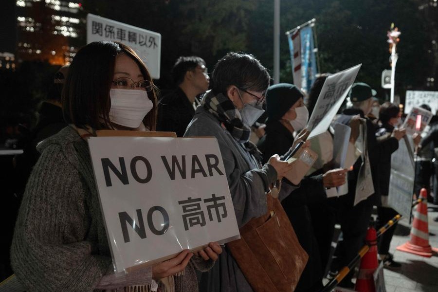 People attend a protest in front of the Japanese prime minister”s official residence in Tokyo, Japan, Nov 21, 2025. [Photo/Xinhua]