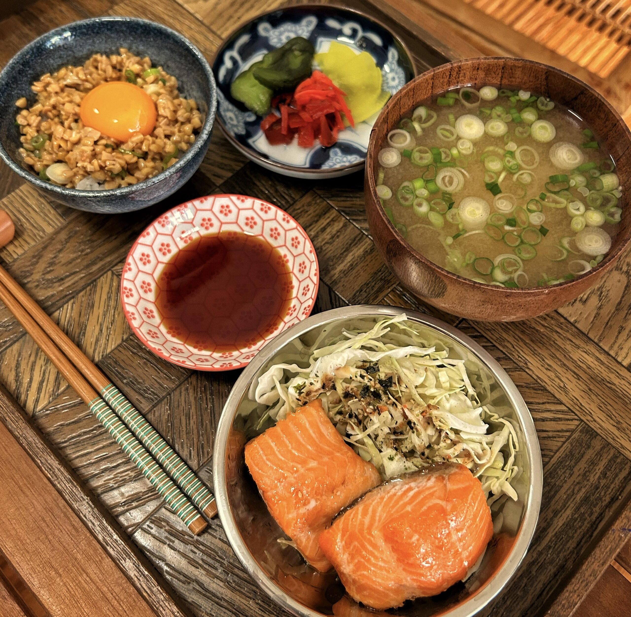 Pictured in this post is simple baked trout with cabbage, miso soup, and tamago kake gohan with natto. Not pictured: hot mugicha ✌️