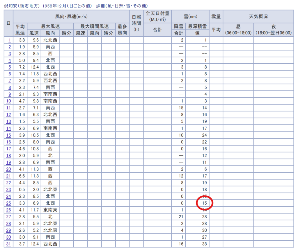 Kutchan Town snowfall records show a snow depth of 15cm on the 25th of December 1958. Image: Japan Meteorological Agency