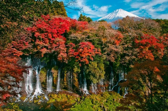 Also in Fujinomiya are the Shiraito Falls. Shiraito means “white threads,” and refers to the dozens of waterfalls that cascade down the cliffsides here, looking like so many strands of silk. The tallest waterfalls are 20 meters high and the widest 150 meters across, and rising into the sky on the far side of the forest behind them is Mt. Fuji, which almost, but not quite, gets upstaged by all the beauty in front of it.