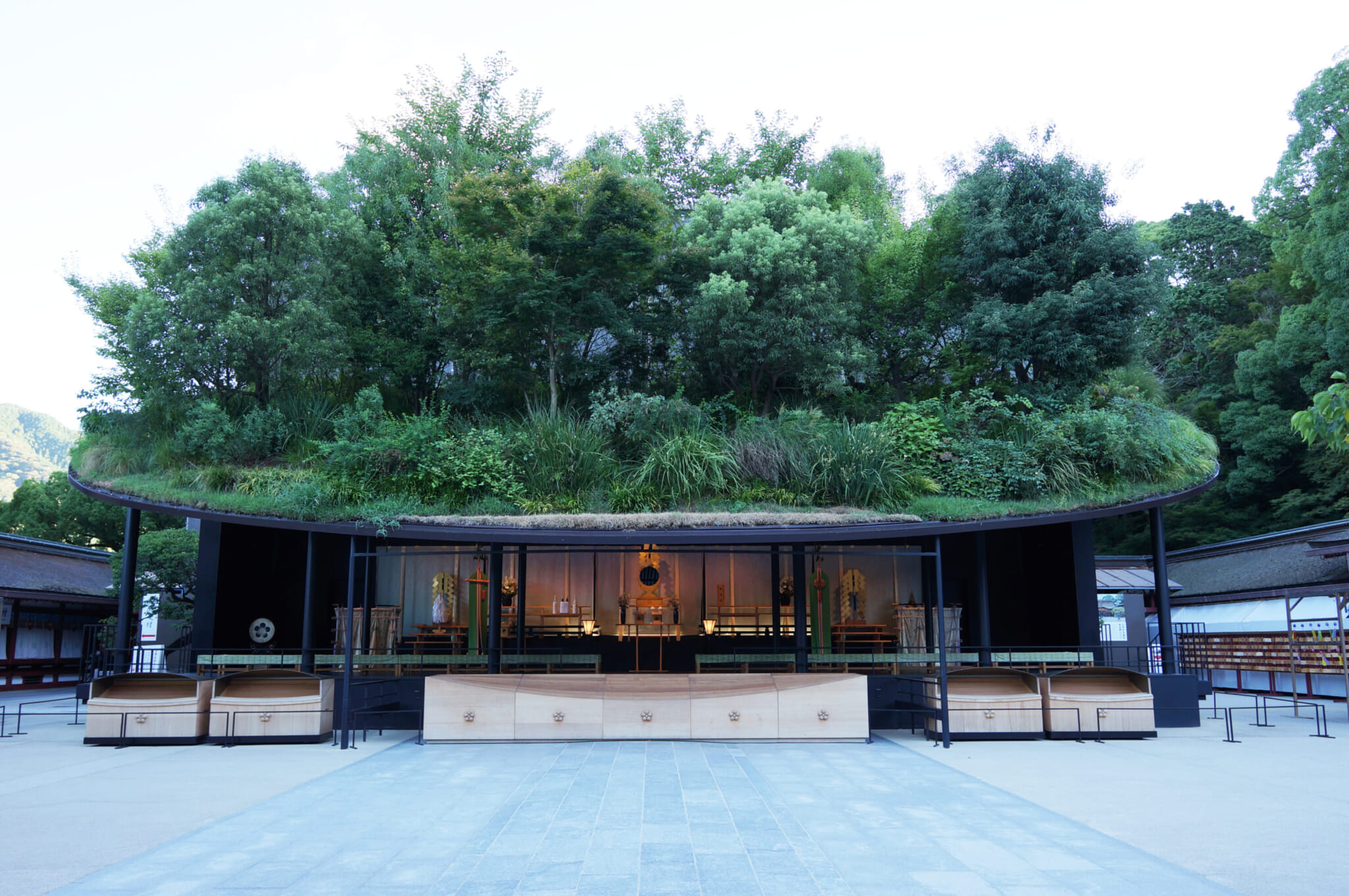 This iteration is defined by a minimalist black structure topped with an elliptical “forest-like” roof planted with plum trees — an homage to the shrine’s legend of the flying plum tree that traveled overnight from Kyoto to Dazaifu to be with Sugawara no Michizane. Inside, textiles created by designer Maiko Kurogouchi’s womenswear brand, Mame Kurogouchi, incorporate plum motifs and ancient dyeing methods, further weaving past and present together.