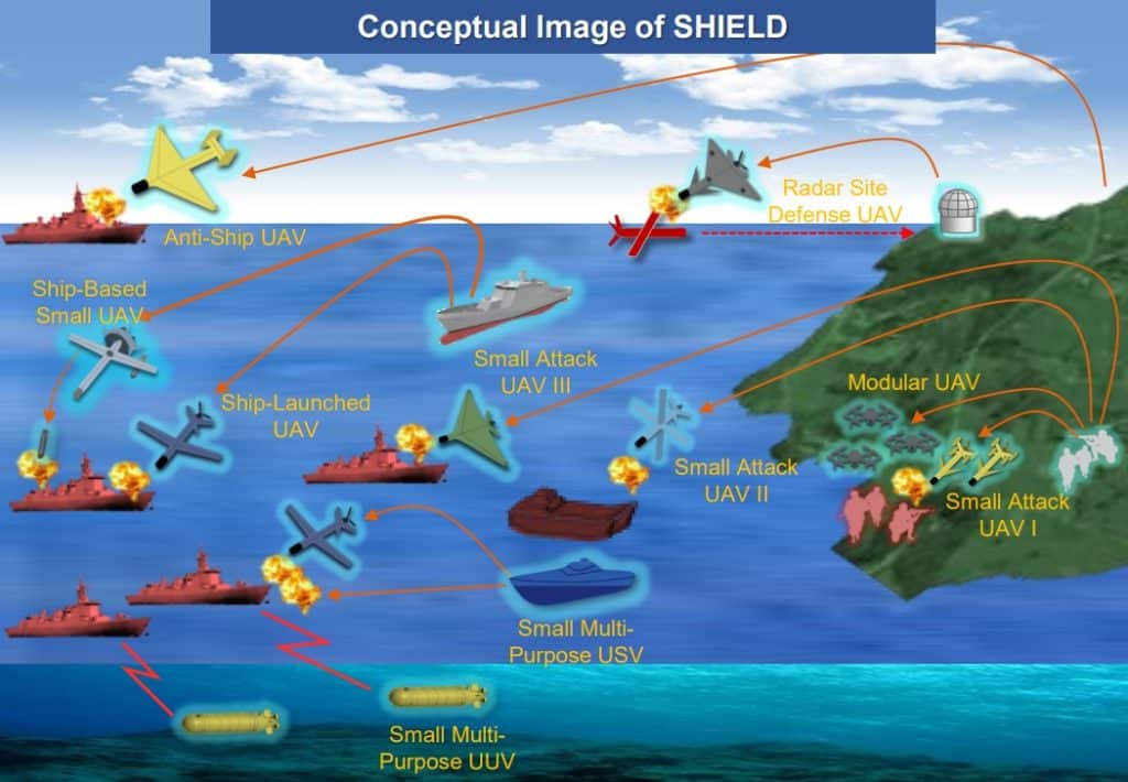 The defense ministry plans to acquire an unspecified number of surface ship-launched UAVs, small ship-based UAVs, and small multi-role USVs for the JMSDF to build SHEILD. The name stands for “Synchronized, Hybrid, Integrated and Enhanced Littoral Defense.”