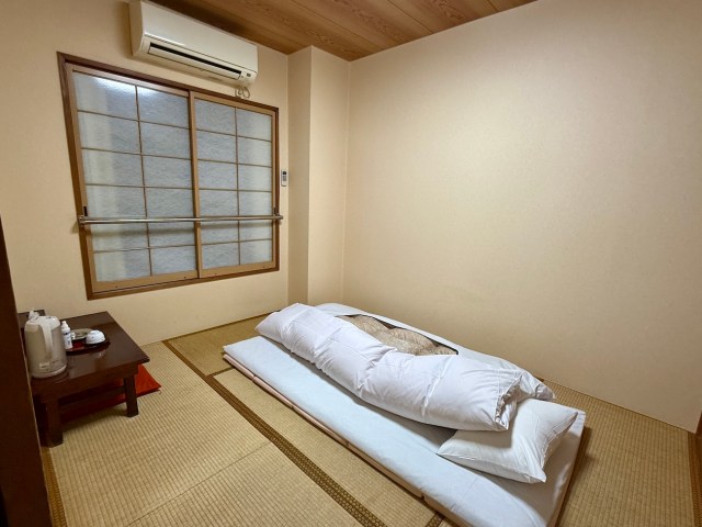 It was a Japanese-style tatami mat room with a traditional futon bed. Yes, it was small, but it was very calming. We would take this over a capsule hotel any day.
