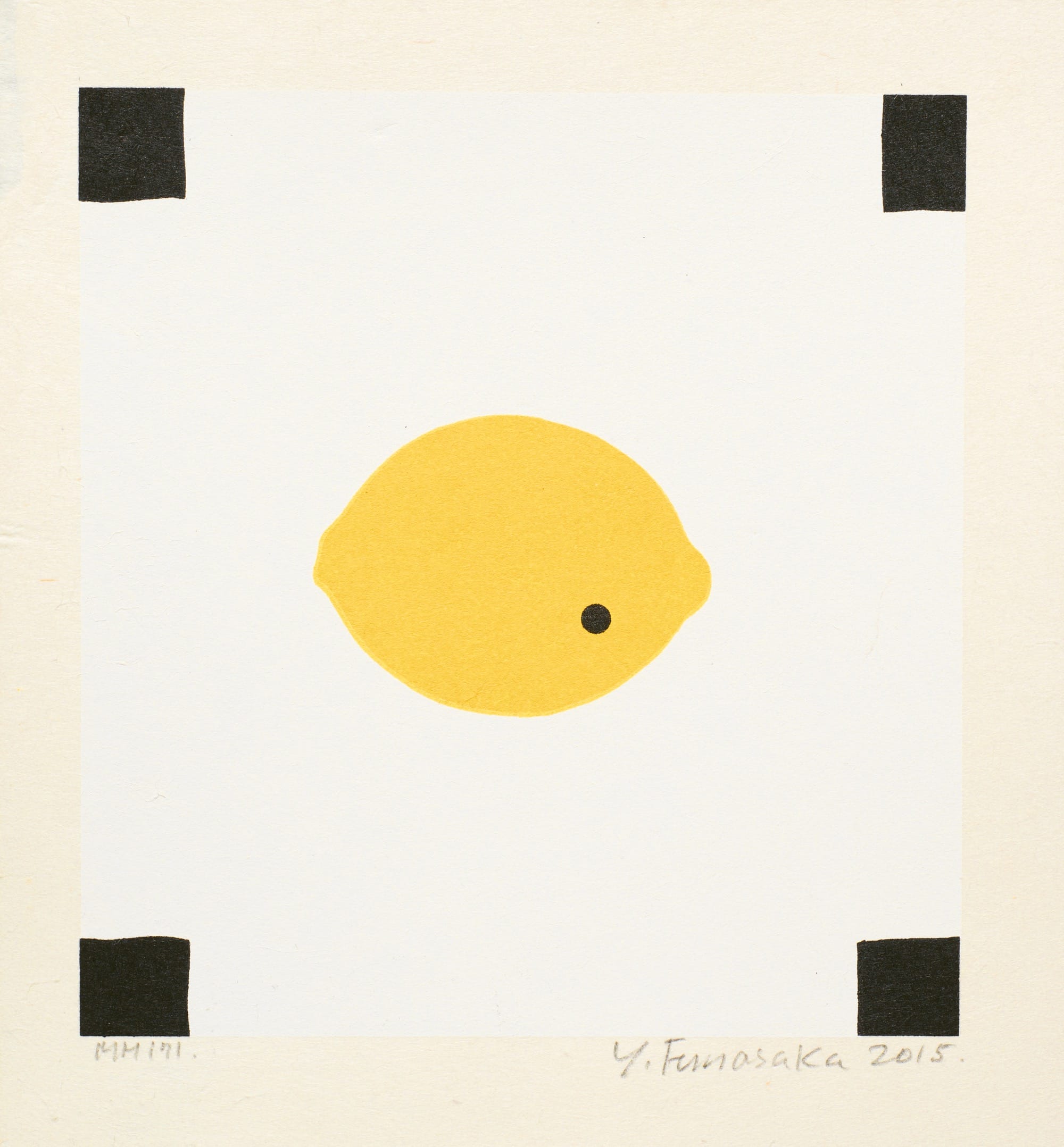 Funsaka Yoshiuke, “Lemon, Black and White, No. MM171” (2015), woodblock print, 8 1/4 × 8 inches. © Yoshisuke Funasaka