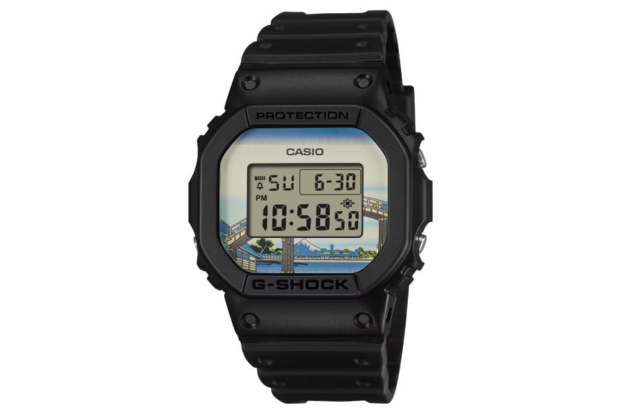 The first model, DW-5600KHFM25-1JR, draws inspiration from Under the Mannen Bridge at Fukagawa. The watch shows a clean, front-facing view of the Mannen Bridge, flowing water beneath it, and Mount Fuji standing quietly in the distance.
