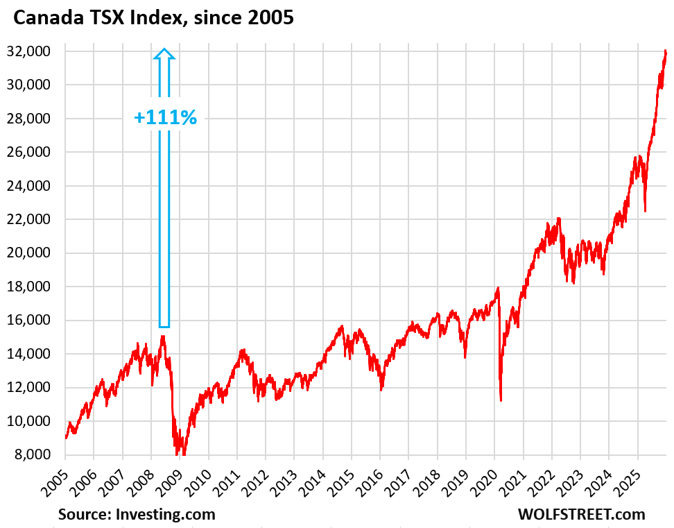 The TSX is denominated in Canadian dollars, which finally rose against the USD in 2025. So expressed in USD, as investors in the US would see it, the TSX did even better in 2025, soaring by 35.5% for the year, and by 47% since the April 8 low. These were huge gains for US-based investors.
