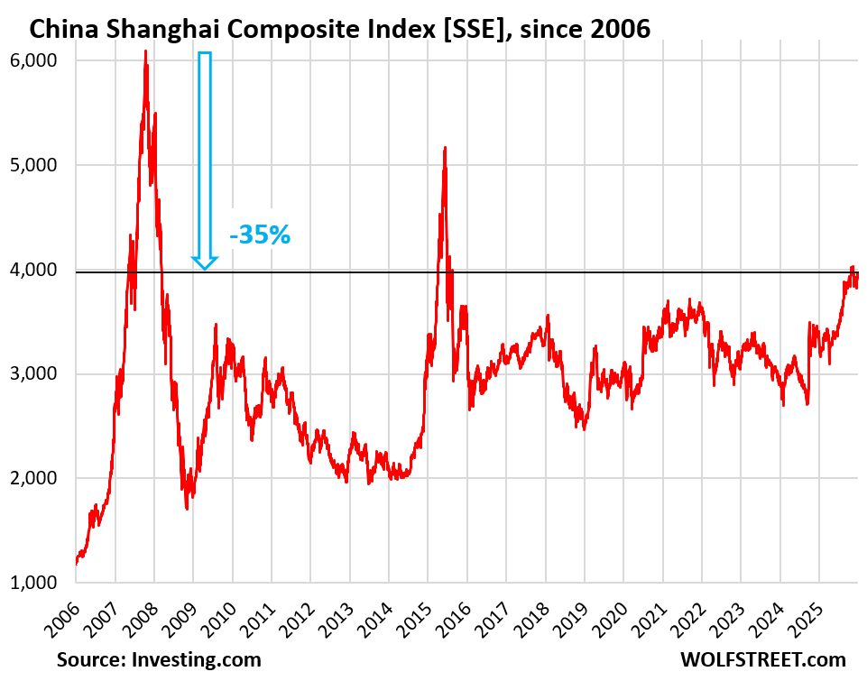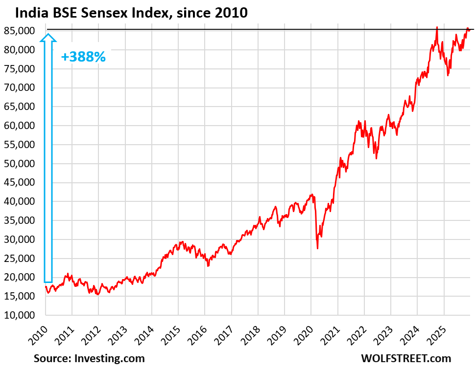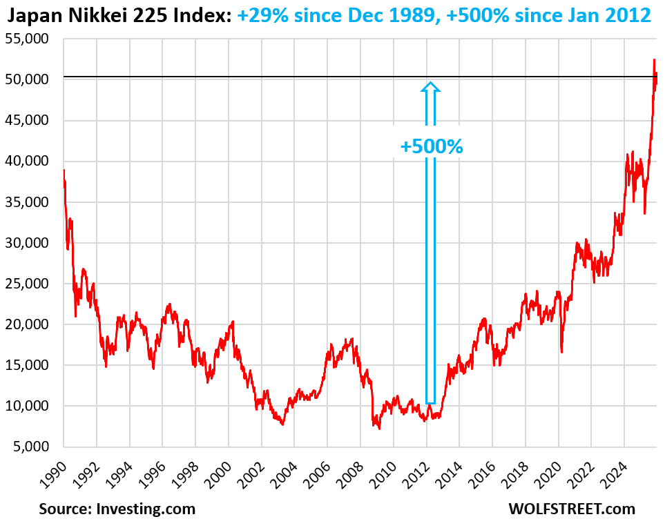 Since January 2012, the Nikkei 225 has soared by 500%, from 8,390 to 50,339, as the Bank of Japan was going hog-wild with QE, that included equity ETFs and ended up putting over half of Japan’s gigantic government debt on the BOJ’s balance sheet, and triggering substantial inflation that it is now trying to contain.