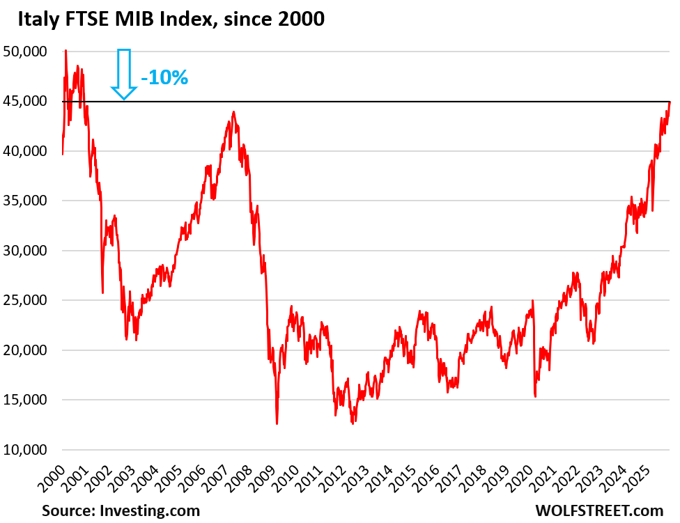 The FTSE MIB soared by 31.5% in 2025, to 44,945, after having risen by 12.3% in 2024. Since October 2022, the index has more than doubled. Since 2012, it has tripled.