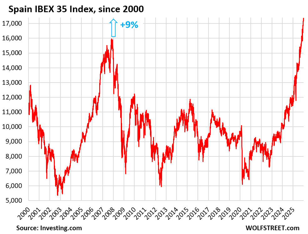 The IBEX 35 exploded by 49% in 2025, to 17,307 after having already surged by 14.8% in 2024, for a two-year gain of 71%! And for a three-year gain of 110%! Hot patootie!