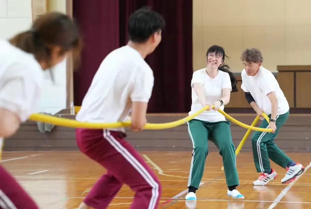 Participants compete in a tug-of-war during a physical education class featuring classic sports day events in the gym.