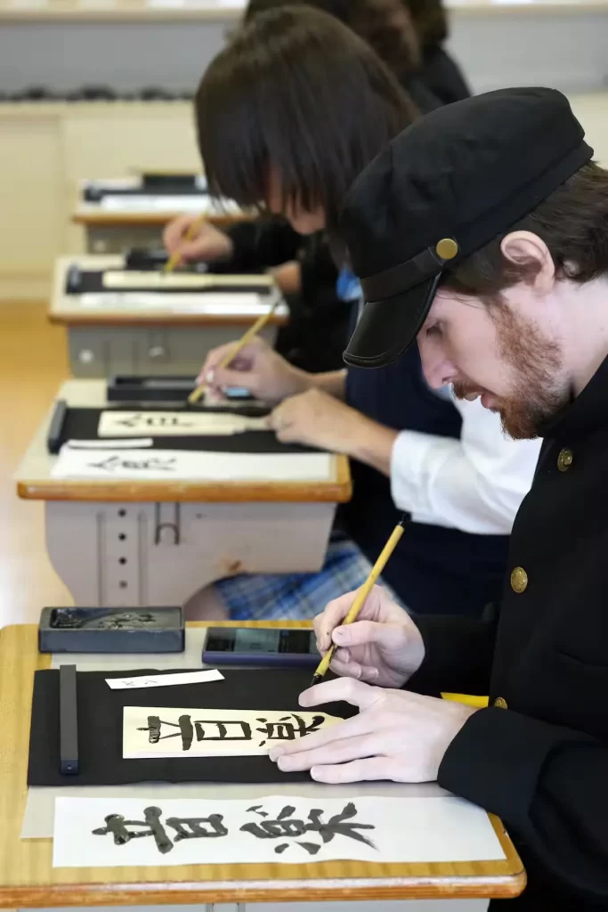 Participants change into their chosen uniforms and pose for photos in front of the “Entrance Ceremony” sign. | Participants during calligraphy class.