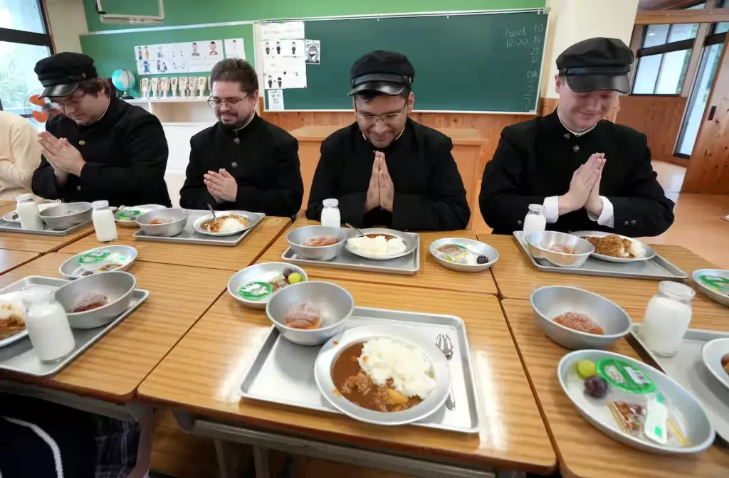 At lunchtime, participants change into kappogi smocks and serve the meals themselves. Desks are pushed together so everyone can eat together in the classroom.