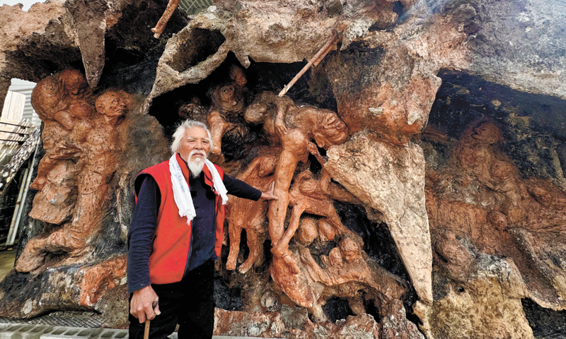 Minoru Kinjo and the sculpture he created themed Battle of Okinawa, on December 23, 2025 Photo: Xing Xiaojing/GT