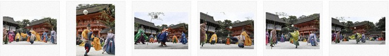 Held at Shimogamo Shrine in Kyoto’s Sakyo Ward, the event saw eight members of the Shukiku Hozonkai (kemari preservation society), wearing colorful traditional clothing, cooperating to keep a white deerskin ball aloft primarily by kicking.