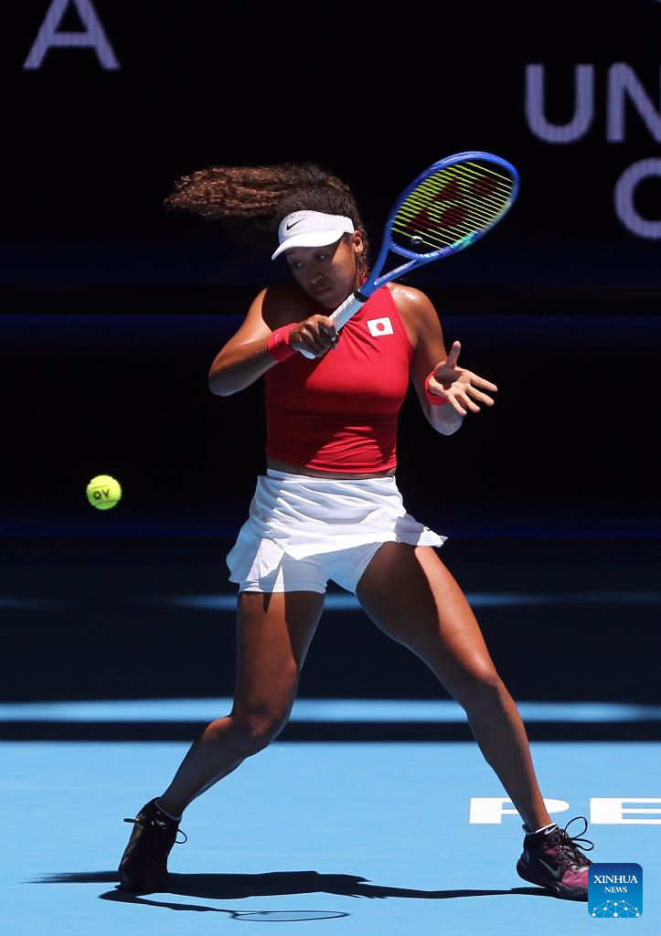 Osaka Naomi hits a return during the women’s singles match between Osaka Naomi of Japan and Katie Swan of Britain in the Group E round robin match between Japan and Britain at the 2026 United Cup tennis tournament in Perth, Australia, Jan. 4, 2026. (Photo by Zhou Dan/Xinhua)