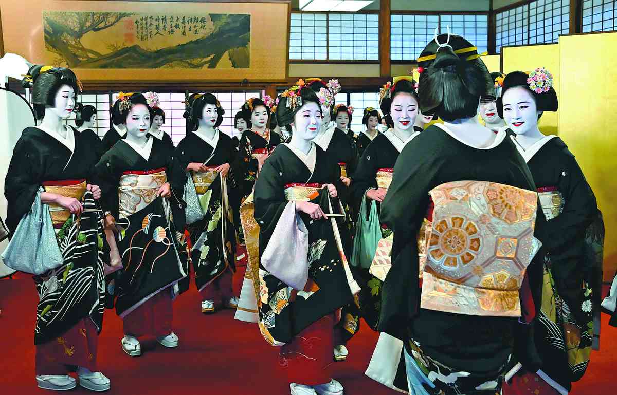 Geiko and maiko exchange greetings before the opening ceremony in Higashiyama Ward, Kyoto, on Wednesday.