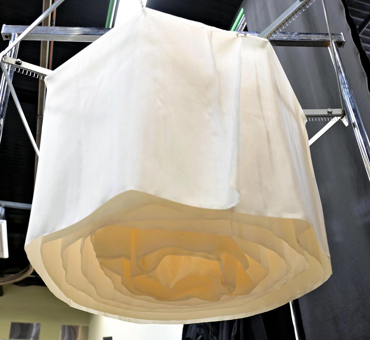 Delicate silk fabrics is loosely wrapped and hung from special hangers before being dipped in dye.