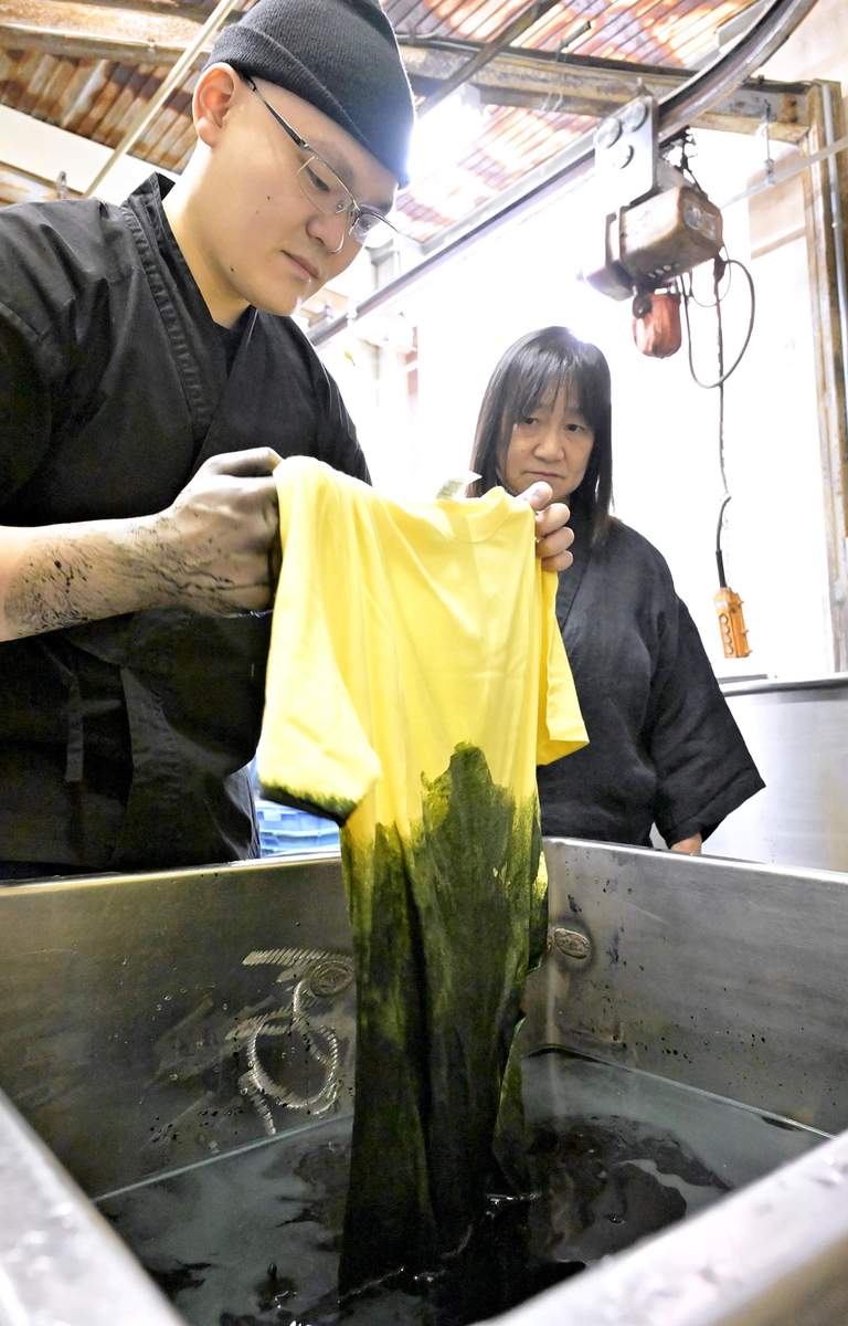 Kengo Banba, left, dips a shirt in a dye solution while his mother, Maki, watches at their workshop in Nakagyo Ward, Kyoto.