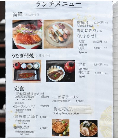 A menu listing a seafood rice bowl priced at 12,000 yen, among other dishes, is seen at a restaurant in the Niseko Hirafu Area, in the town of Kutchan, Hokkaido, Oct. 29, 2025. (Mainichi/Ayako Morihara)