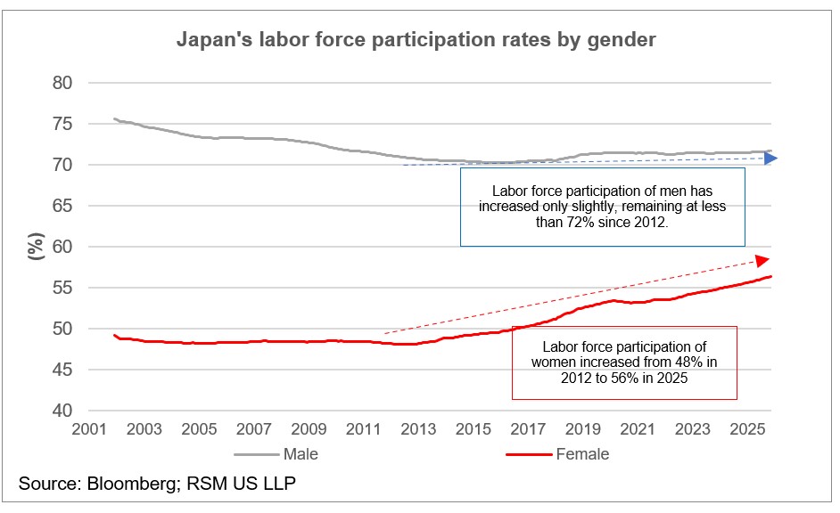 Today, Japan’s women are working at record levels, with their labor force participation rate reaching 56% in 2025 from 48% n 2012.